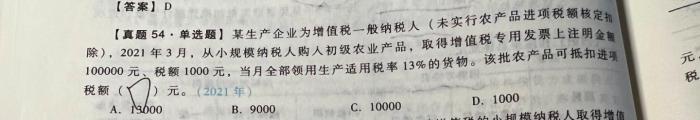 税法一2021年原题求教 增值税农产品进项税核定扣除 某生产企业为增值税一般纳税人(未实行农产品进项税额核定扣除),2021年3月,从小规模纳税人购入初级农业产品,取得增值税专用发票上注明金额100000元、税额1000元,当月全部领用生产适用税率13%的货物。该批农产品可抵扣进项税额是多少元? 求教真正的大神们为什么这道题的答案是1000,纳税人购进用于生产13%税率的货物时,不是可以按照10%的扣除率计算进项税额么?