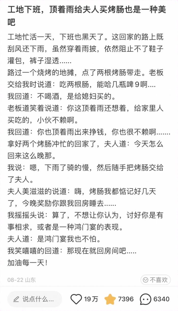 回到家后,夫人美滋滋地说,烤肠已经惦记好几天了,今晚奖励你跟我回房睡。