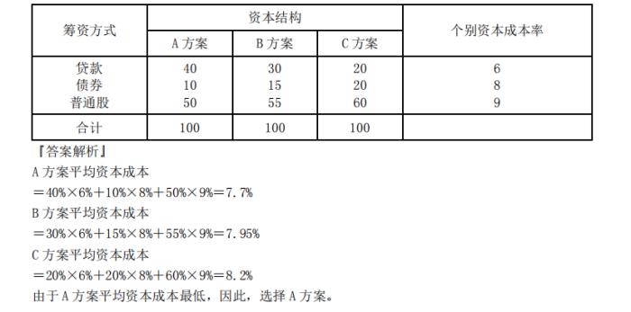 通过计算和比较各种可能的筹资组合方案的平均资本成本,选择平均资本成本率 最低的方案。这种方法侧重于 从资本投入的角度对筹资方案和资本结构进行优化分析。长达公司需筹集 10000 万元长期资本,可以从贷款、发行债券、发行普通股三种方式筹集,其个别资本成本率已分别测定,有关资料如表 5-10 所示。 要求:采用平均资本成本比较法进行方案的选择。 表 5-10 长达公司资本成本与资本结构数据表 单位:%