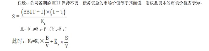 在考虑市场风险基础上,以公司市场价值为标准,进行资本结构优化。即 能够提升公司价值的资本结构,是合理的资本结构。 这种方法 主要用于对现有资本结构进行调整,适用于资本规模较大的上市公司资本结构优化分析。 在公司价值最大的资本结构下,公司的平均资本成本率也是最低的。 设:V 表示公司价值,B 表示债务资金价值,S 表示权益资本价值。公司的价值应该等于资本的市场价值,即V=S+B