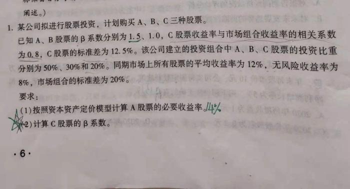 某公司拟进行股票投资,计划购买A、B、C三种股票。已知A、B股票的β系数分别为1.5、1.0,C股票收益率与市场组合收益率的相关系数为0.8,C股票的标准差为12.5%。该公司建立的投资组合中A、B、C股票的投资比重分别为50%、30%和20%。同期市场上所有股票的平均收益率为12%,无风险收益率为8%,市场组合的标准差为20%。要求:(1)按照资本资产定价模型计算A股票的必要收益率。4%2)计算C股票的系数。