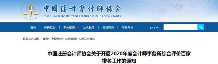 为做好2020年度会计师事务所综合评价百家排名工作,落实《会计师事务所综合评价排名办法》(会协〔2021〕22号)(以下简称《办法》)的规定与要求,现将有关事项通知如下: