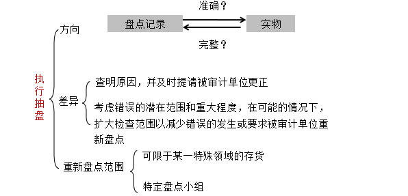 存货监盘程序 | (4)执行抽盘* | 避免事先了解;记录测试情况;获取管理层完成的存货盘点记录的复印件 |