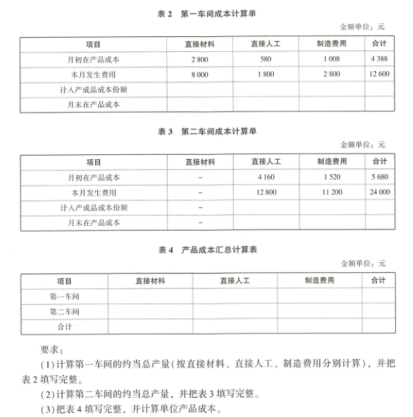 工半成品的数量)之和另外还要注意:本题中原材料在生产开始时一次投入,所以计算第一车间广义在产品约当产量时,直接材料的在产品完工程度按照100%计算。