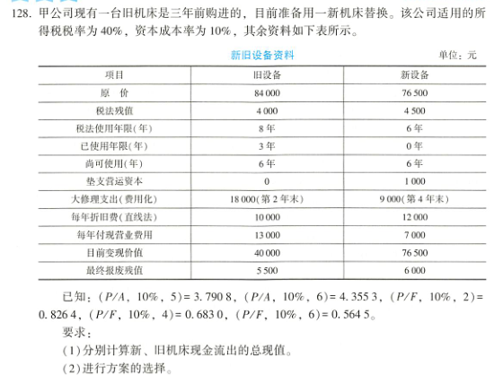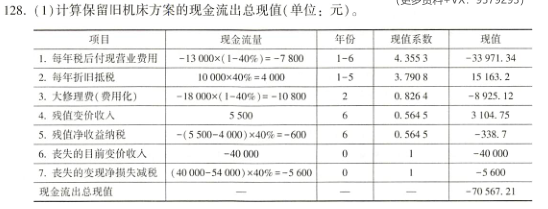 (2)在两方案营业收入一致的情况下,新设备现金流出总现值为74 962. 22元,旧