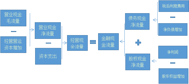 如图,经营现金流量(实体现金流量)=金融现金流量=债务现金流量+股权现金流量。
