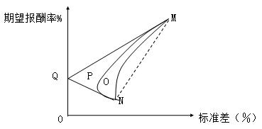 【解析】对于由两种资产构成的投资组合而言,相关系数越小,机会集曲线越弯曲,曲线MQN为相关系数为-1的机会集曲线,曲线MPN为相关系数0.3的机会集曲线,曲线MON为相关系数为0.6的曲线,直线MN为相关系数为1的机会集曲线,因此选项A是答案。