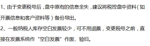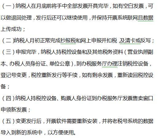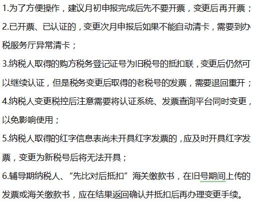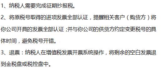变更税号前的准备 (一)增值税一般纳税人 (二)小规模纳税人(不包括定期定额征收户) (三)温馨提示 变更所需要的事项及流程 一、换发新版“营业执照”(工商部门) 各企业根据所在地工商部门的要求,填写相应的表格,去当地工商部门审批中心办理即可,核发新营业执照后,老的营业执照、税务登记证、组织机构代码证将缴销,纳税人将持有营业执照正本、副本各一份,建议申请多个副本,便于企业经营。 二、变更税务登记号(税务部门) 工商变更完成后,需要持新的营业执照去所属税务机关变更信息。建议纳税人月初申报完成后再变更税务登记号,变更的同时需要对在用的税控设备重新发行。 三、税控设备变更发行(税务部门) 强调注意事项: 四、银行信息变更,重新签署“税银联网三方协议”(银行系统) 开设银行账户时按规定要登记税务登记证号,税务登记变更后及时去银行重新进行账务登记,重新签订税局扣款的协议! 五、税务数字(一证通)证书更换(服务商) 关于申报系统,如果申报有UK或者U盾的,变更后也要及时找当地服务商变更信息,如果申报不需要其他设备直接登录办税平台的,办理后可以登陆测试一下是否能够登陆成功,否则需要立即与相关的服务单位联系。 六、重新刻制“发票专用章” 发票专用章中要求刻入税务登记证号,号码升位后,纳税人最好及时申请刻制印章。如果所使用的章中有税号的,都要及时更换。 七、涉及号码变更的其他事项(统计局、民政局、网站备案…) 纳税人还要到其他涉及税号营业执照编号的部门逐一办理税号、营业执照的变更,请勿遗漏。 温馨提醒:2018年1月1日前,原发证照继续有效,过渡期结束后一律使用加载统一代码的营业执照。所以请纳税人及时换照,也请及时办理税务登记号变更。