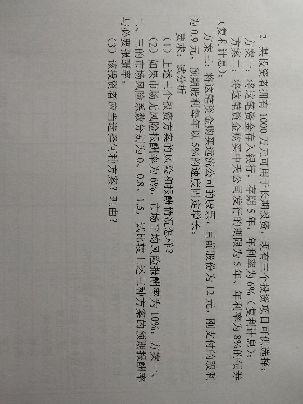 某投资者拥有1000万元可用于长期投资,现有三个投资项目可供选择:方案一:将这笔资金存入银行,存期5年,年利率为6%(复利计息); 方案二:将这笔资金购买中天公司发行的期限为5年、年利率为8%的债券(复利计息)