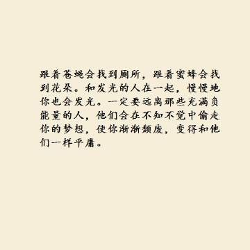 一定要远离那些充满负能量的人,他们会在不知不觉中偷走你的梦想,使你渐渐颓废,变得和他们一样平庸。