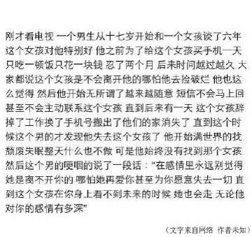 “ 永远别觉得她离不开你!你就肆无忌惮。哪怕她再爱你,甚至为你愿意失去一切。但直到这女孩在你身上看不到未来时,伤心欲绝、痛到极点的她也会离开,无论她曾经对你的感情有多深……”